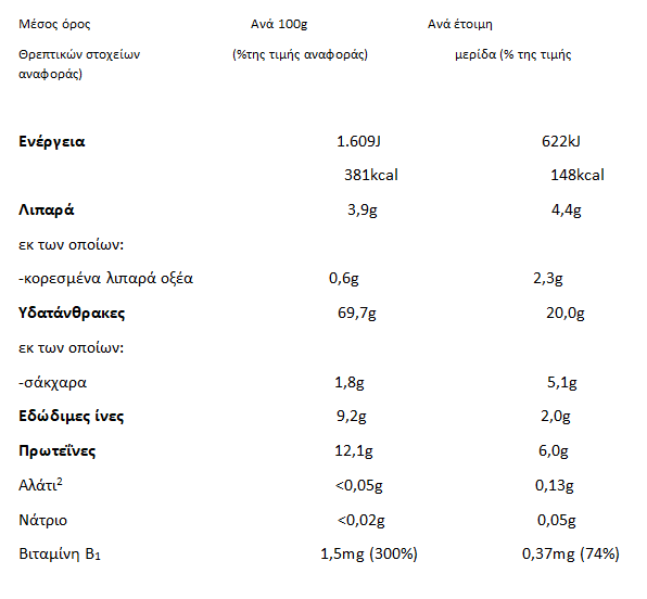 80% άλευρα ολικής άλεσης(βρώμη*, σιτάρι* , κριθάρι*, όλυρα* , σίκαλη) σιμιγδάλι σίτου* , βιταμίνη Β1.