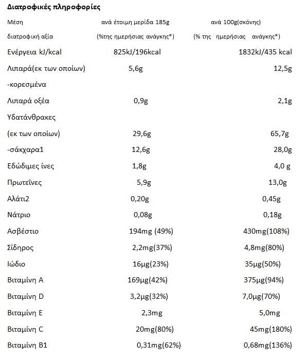 Ορός γάλακτος* , αλεύρι σιταριού ολικής άλεσης* 24%, αποβουτυρωμένο γάλα σε σκόνη* 14% , σιμιγδάλι σιταριού*, φυτικά έλαια*(ηλιέλαιο*, κραμβέλαιο*), μπισκότα* 10% (αλεύρι σιταριού*, ορός γάλακτος*, βούτυρο*, άμυλο σιταριού*), ανθρακικό ασβέστιο, βιταμίνη C, πυροφωσφορικός σίδηρος, βιταμίνη Ε , βιταμίνη Β1 , βιταμίνη Α, ιωδικό κάλιο, βιταμίνη D.