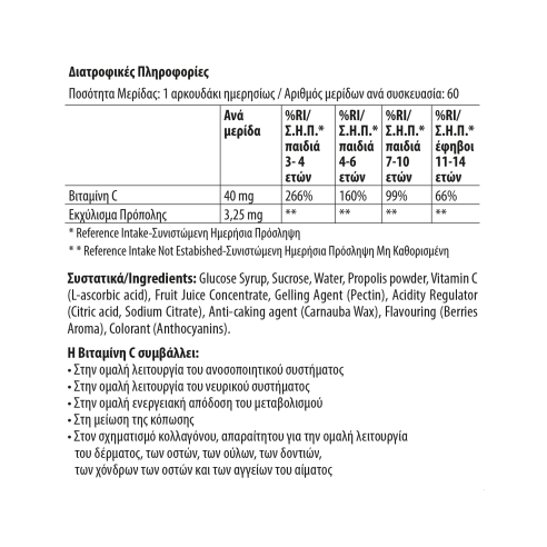 Συστατικά/Ingredients: Glucose Syrup, Sucrose, Water, Propolis powder, Vitamin C (L-ascorbic acid), Fruit Juice Concentrate, Gelling Agent (Pectin), Acidity Regulator (Citric acid, Sodium Citrate), Anti-caking agent (Carnauba Wax), Flavouring (Berries Aroma), Colorant (Anthocyanins). Αρ. Γνωστ. ΕΟΦ: 68102/20.06.2022. Το προϊόν δεν υπόκειται σε διαδικασία αδειοδότησης.